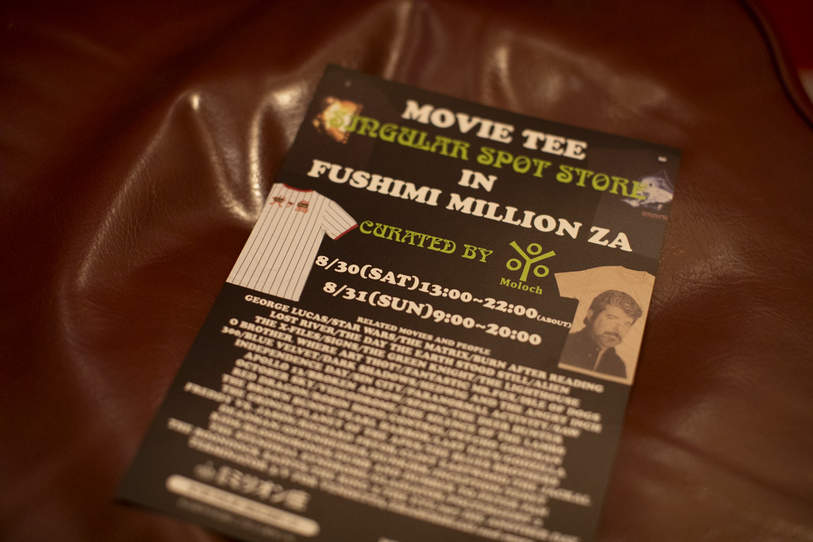 「伏見ミリオン座」の支配人が実は大学の先輩だったんですよ。それで知人に紹介してもらって、一度呑みに行かせてもらって。そうしたら、映画館でもいろんなコンテンツを探しているから、何かイベントができれば良いねっていう話になって。それで、僕が元々集めていた映画Teeを販売するというイベントをやることになったんです。そもそもは全く手放す気はなかったんですが、映画館でやれるなら… ということで。本当に欲しいと思ってくれる人の手に届けば良いなと思ってます(笑)。